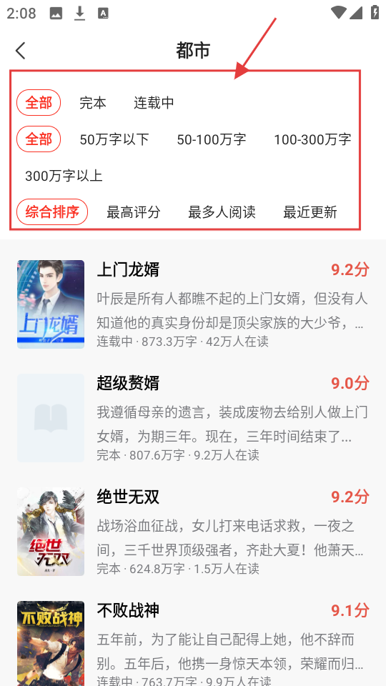3、都市小说分类页可按字数、排序等筛选,找到《超级赘婿》,超高效啦。