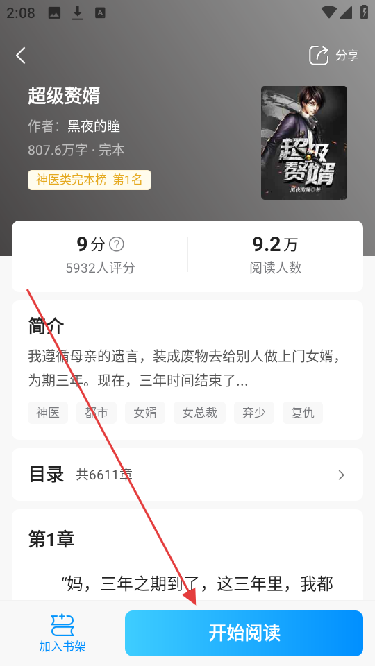 4、《超级赘婿》详情页点【开始阅读】,进入阅读界面,开始读小说,是不是很赞呀。