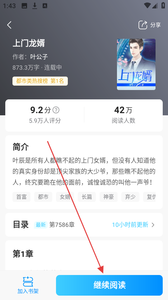 2、在书籍详情页点击【继续阅读】,就能进入阅读界面,继续阅读书籍内容啦。