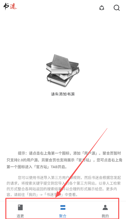 1、首先,你需要导入书源才能使用软件,进入“书源管理”后,点击右上角图标,这是找书看书的基础呢。