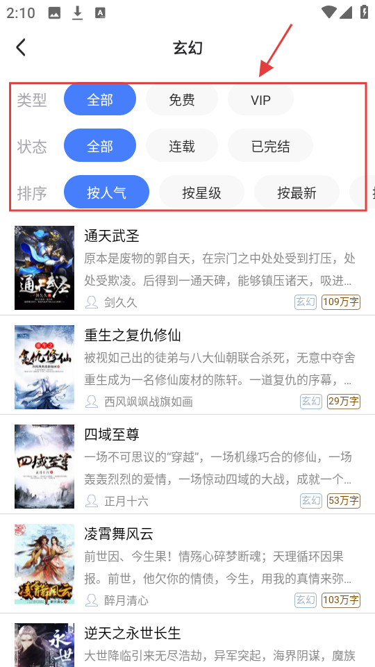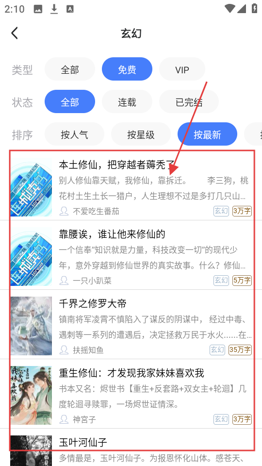 3、玄幻分类里可按类型、状态、排序筛选,比如选【免费】【按最新】,找书更高效呢。