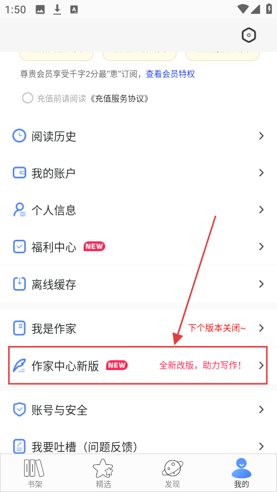2、进入个人页面后,点击【作家中心新版】,可进入作家福利页面,了解作家福利信息哦。