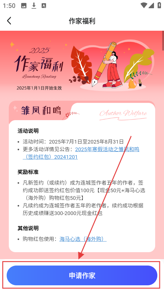 3、在作家福利页面,点击【申请作家】,可进入申请作家页面,准备申请成为作家啦。