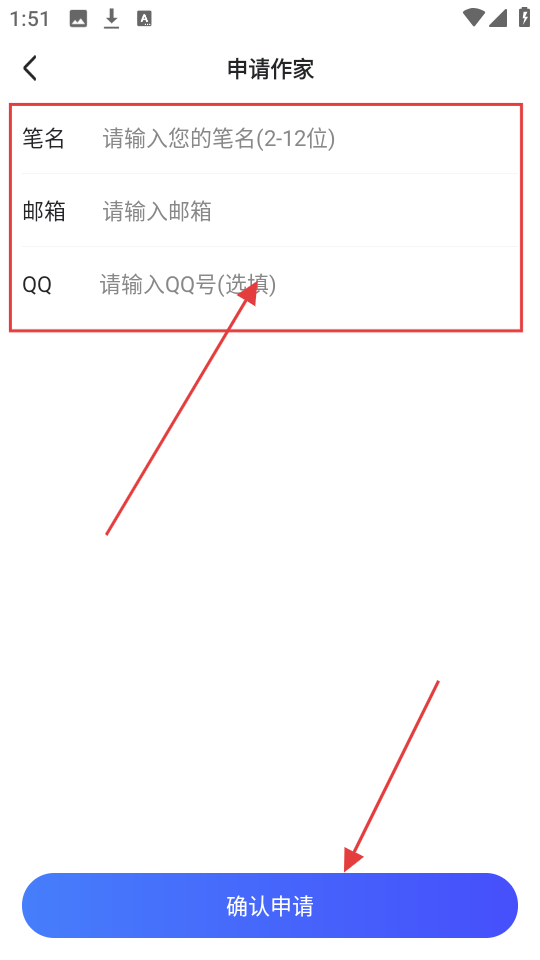 4、在申请作家页面,填写笔名、邮箱、QQ号,点击【确认申请】,即可提交作家申请哦。