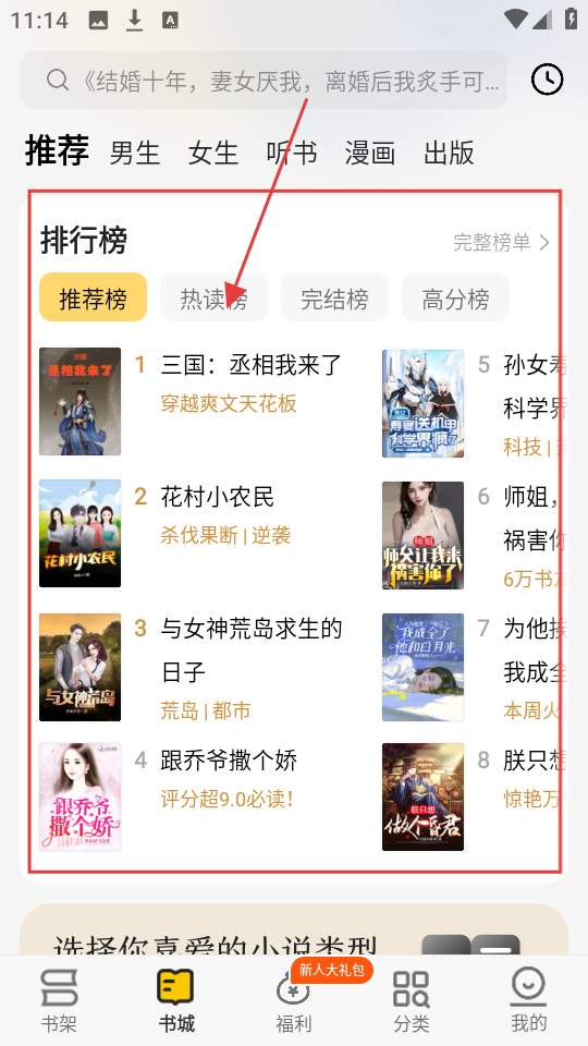 1、在书城排行榜板块,有推荐榜、热读榜等榜单,点击感兴趣的小说即可进入详情页,开启阅读哦。