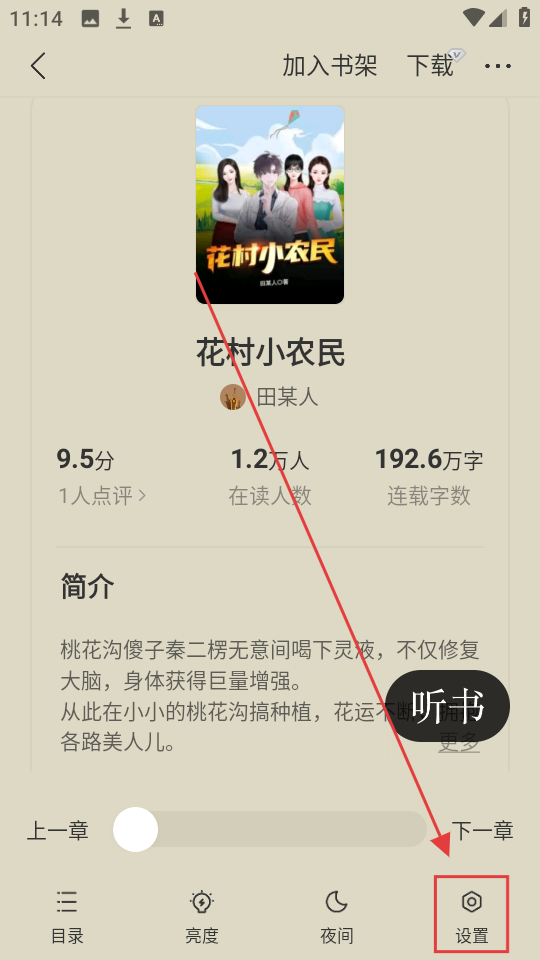 2、进入小说详情页后,底部有【设置】按钮,点击它可进入设置界面,调整阅读相关参数啦。