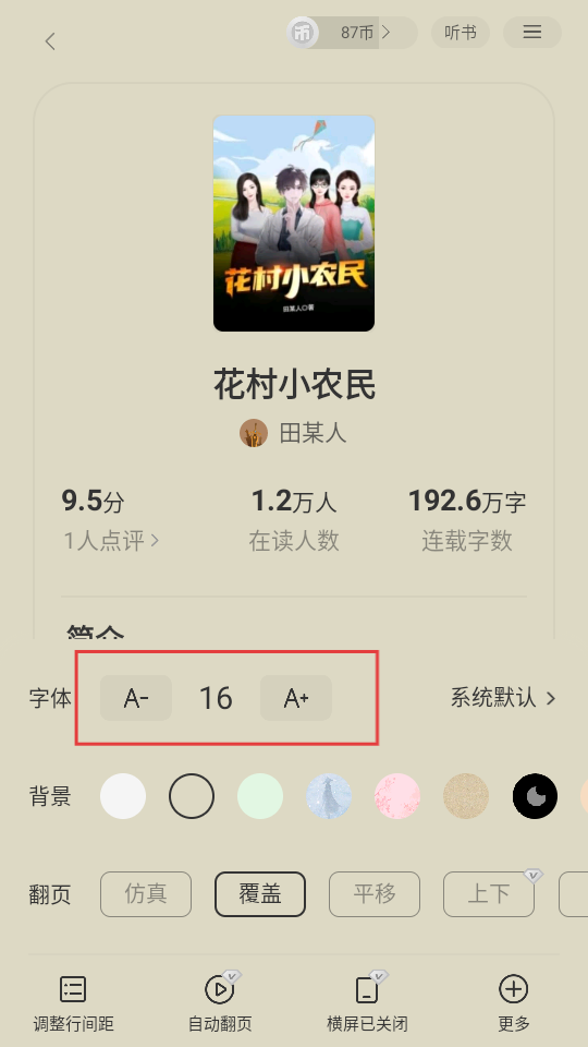 3、在设置界面,有字体大小调节选项,可点击【A-】或【A+】来调整字体大小,适配阅读习惯哦。
