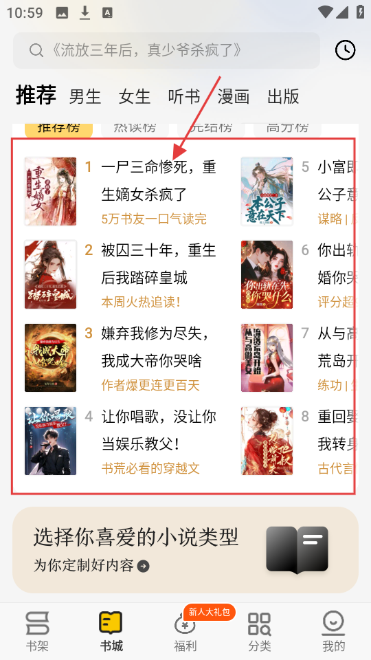 1、在书城推荐板块,有各类热门小说,点击感兴趣的小说就能进入详情页,开启阅读之旅啦。
