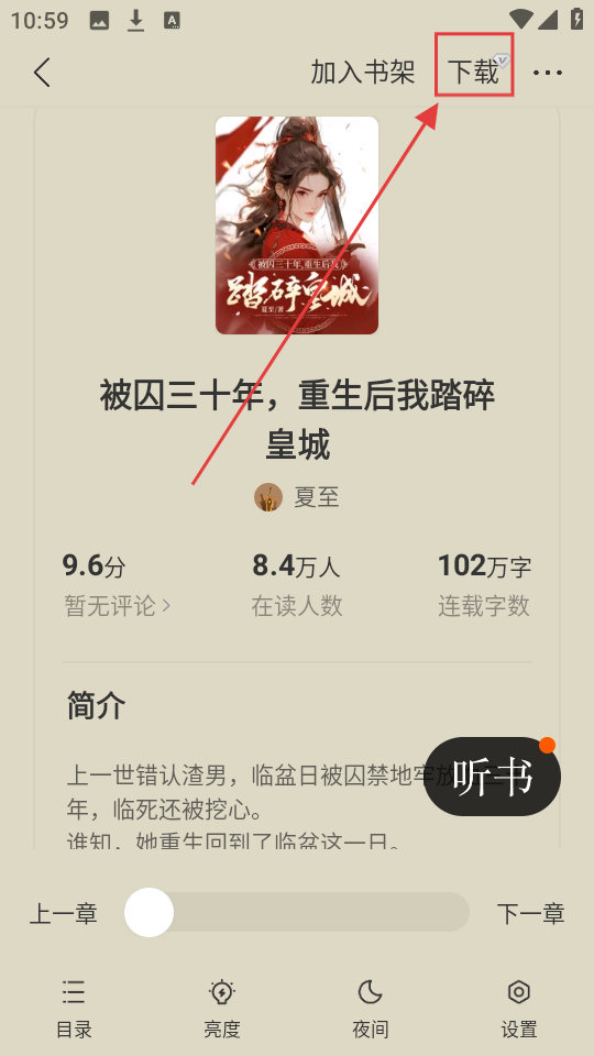 2、进入小说详情页后,顶部有【下载】按钮,点击它可开启小说下载流程哦。