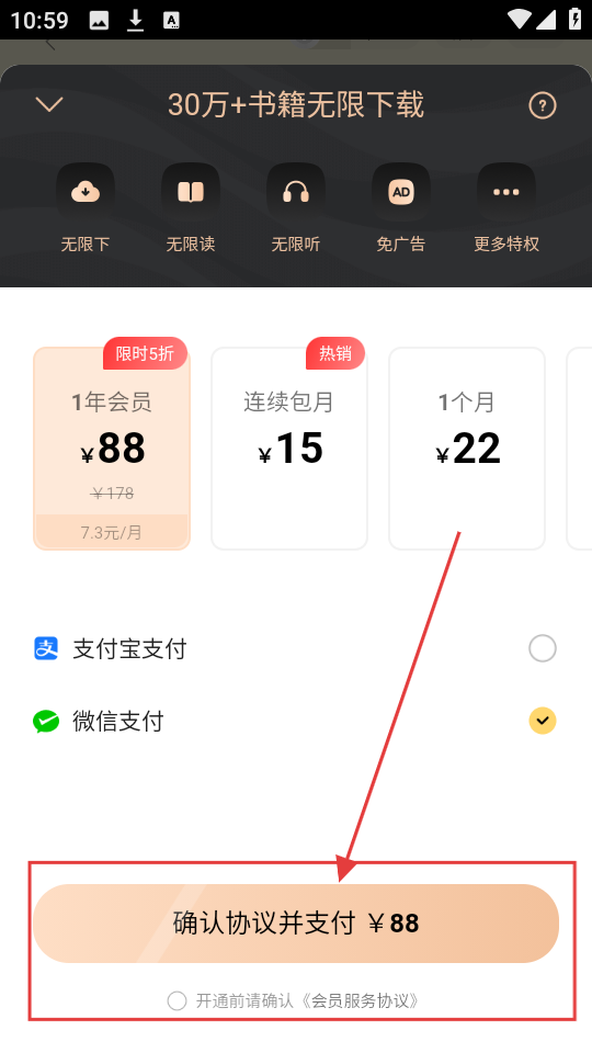 4、若选择开会员,进入会员支付页面后,点击【确认协议并支付】按钮,即可开通会员并下载小说啦。