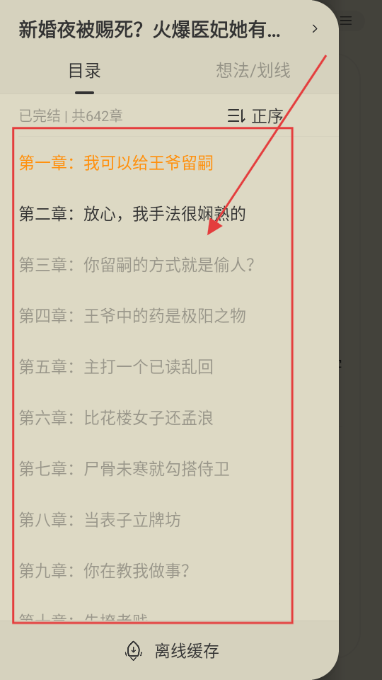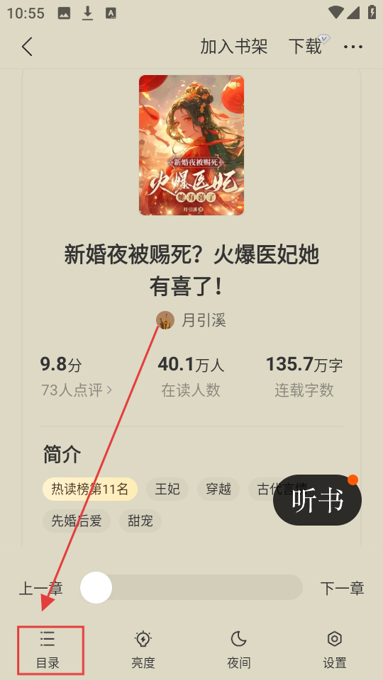 2、在小说详情页,点击左下角【目录】按钮,进入小说目录页面,查看章节列表哦。