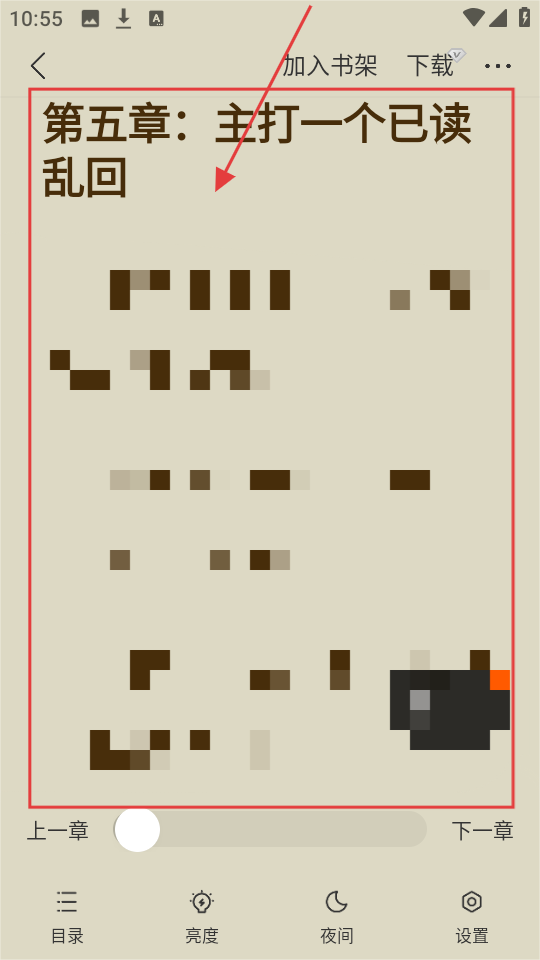 3、在小说目录页面,选择想要阅读的章节,比如【第五章:主打一个已读乱回】,点击进入该章节阅读页面呢。