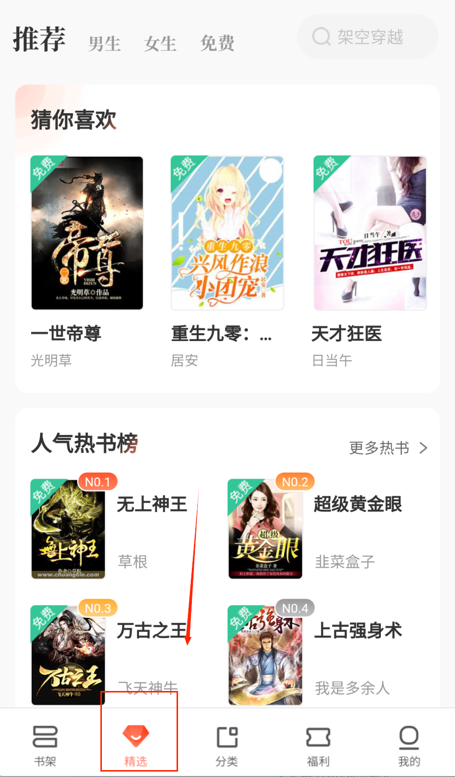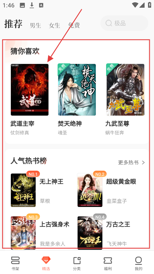 1、精选页面“猜你喜欢”和“人气热书榜”有很多精彩小说,像【武道主宰】就很值得一读,快选一本开启阅读吧。