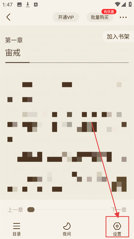 2、进入小说阅读页后,若想调整阅读相关设置,就点击右下角【设置】,打开设置选项开始操作。