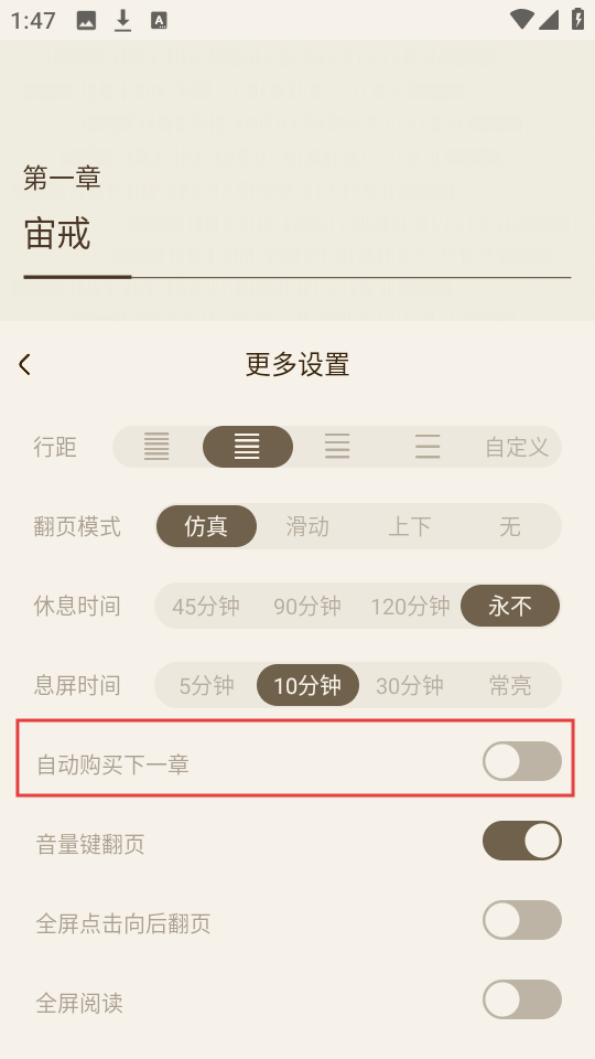 4、进入更多设置后,若想开启自动购买下一章功能,就找到“自动购买下一章”选项,将其开关打开即可。