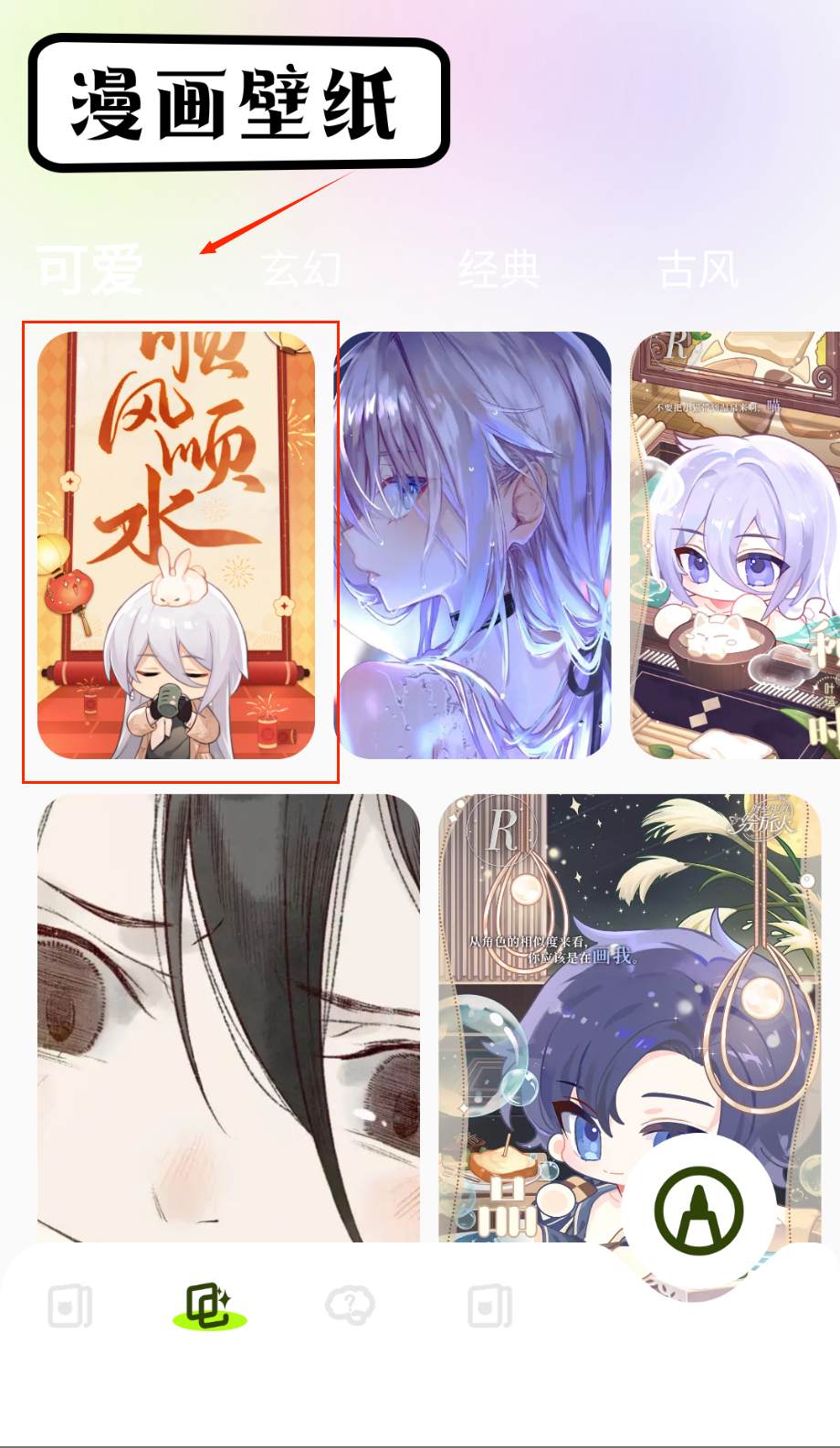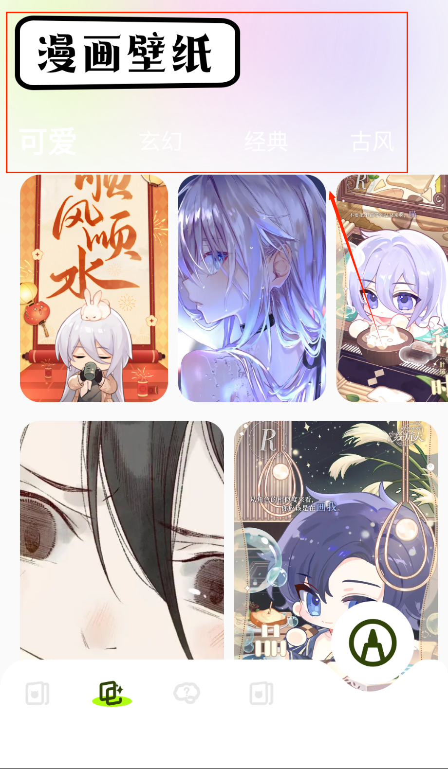 4、在漫画壁纸板块浏览分类标签如可爱或玄幻,看到喜欢的图片长按保存到手机相册,之后在系统设置中将其设为壁纸。