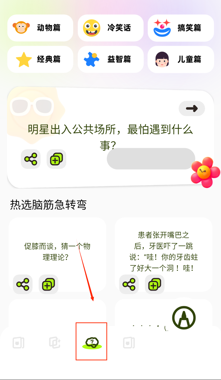 3、点击底部导航栏切换到首页,这里有一排分类按钮如动物篇、冷笑话等,选择感兴趣的分类。