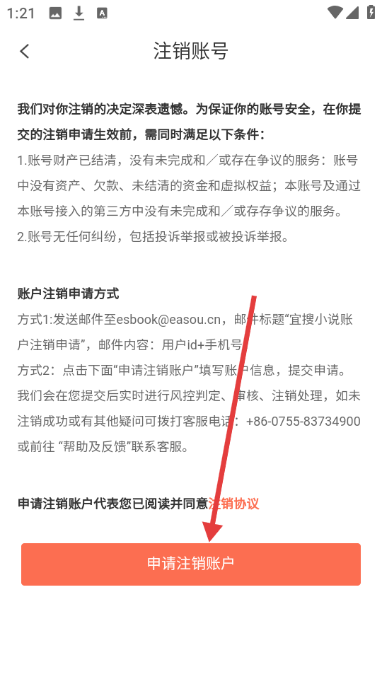 4、进入注销账号页面后,仔细阅读相关条件和申请方式,确认后点击【申请注销账户】,即可提交注销申请。