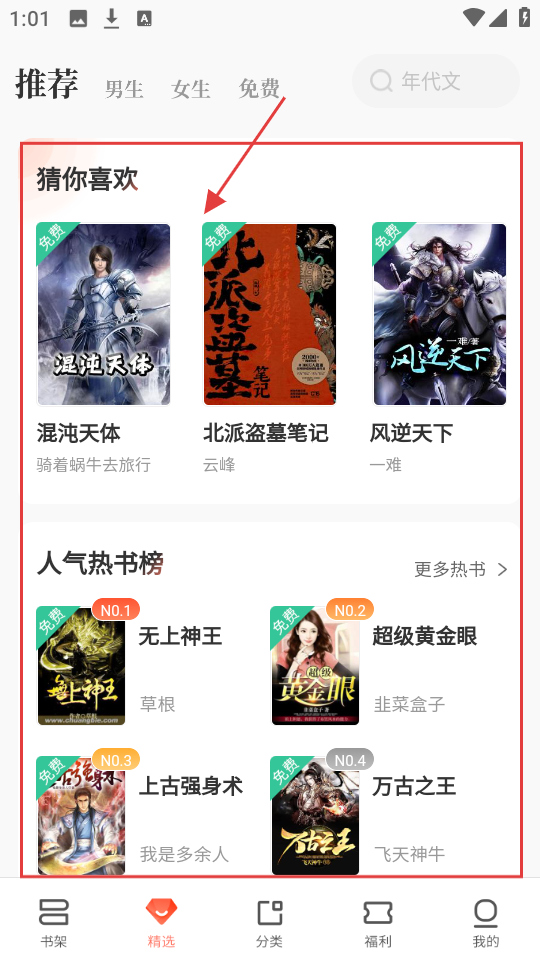 1、精选页面“猜你喜欢”和“人气热书榜”有好多精彩小说,像【北派盗墓笔记】就很值得一读,快选一本看看吧。