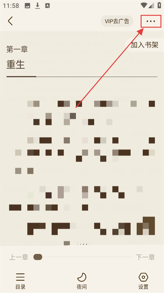 2、在小说阅读界面,点击右上角的三点菜单按钮,展开更多功能选项,以便找到添加书签的入口哦。