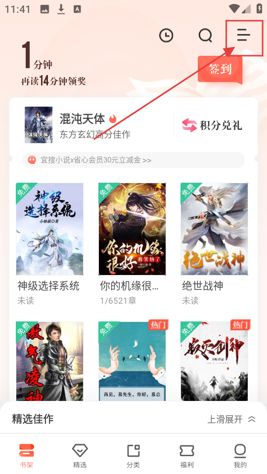 2、在书架页面,点击右上角的菜单按钮,展开功能选项,以便找到导入本地书籍的入口哦。