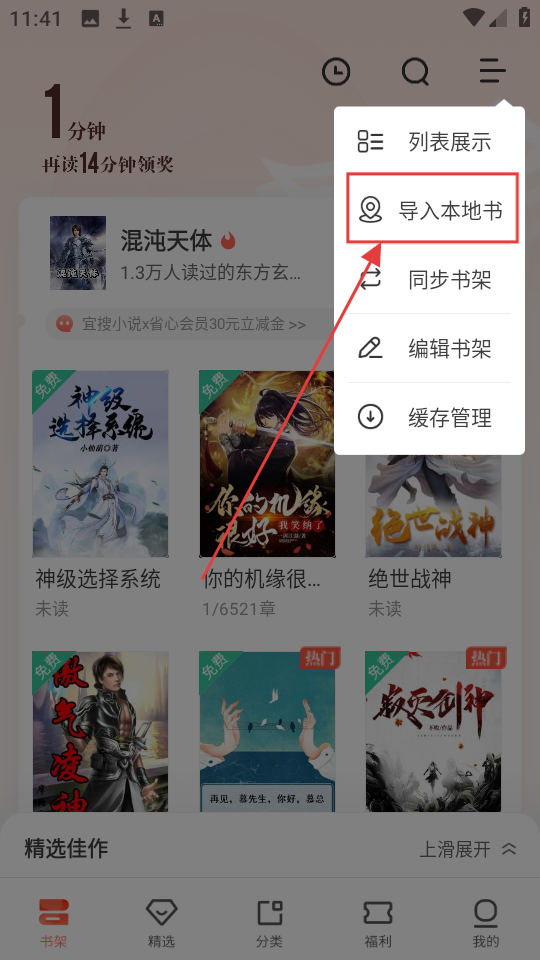 3、在展开的菜单中,选择【导入本地书】选项,进入本地文件选择页面,选择要导入的小说。