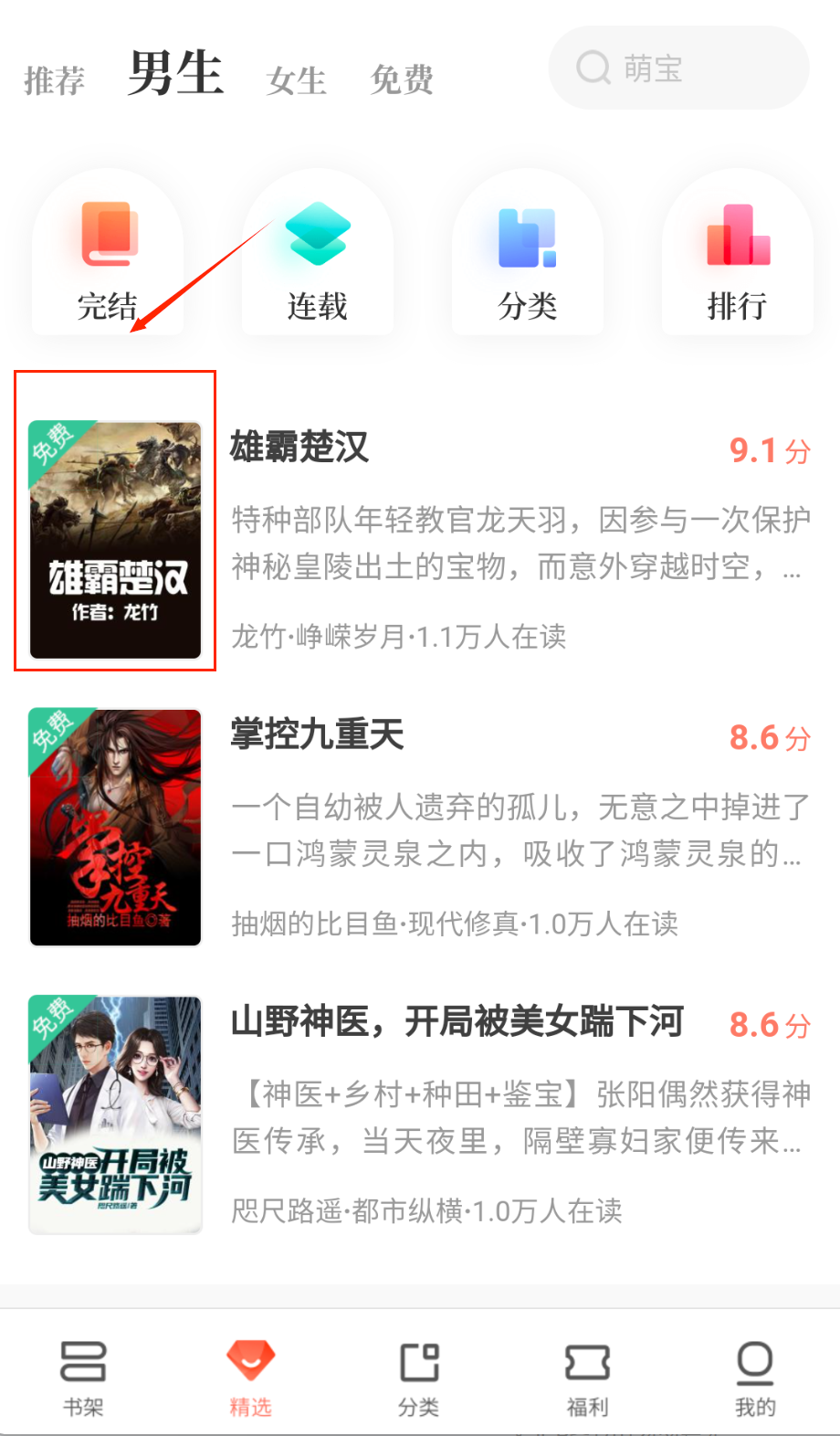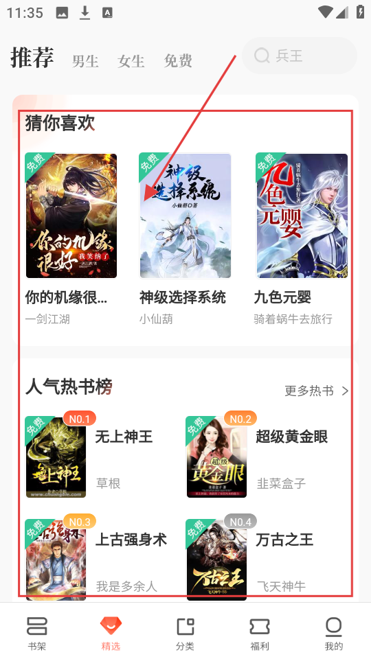 1、我们进入软件精选页面,能看到【猜你喜欢】【人气热书榜】这些板块,若有看中的小说,像【神级选择系统】,就点击它吧。