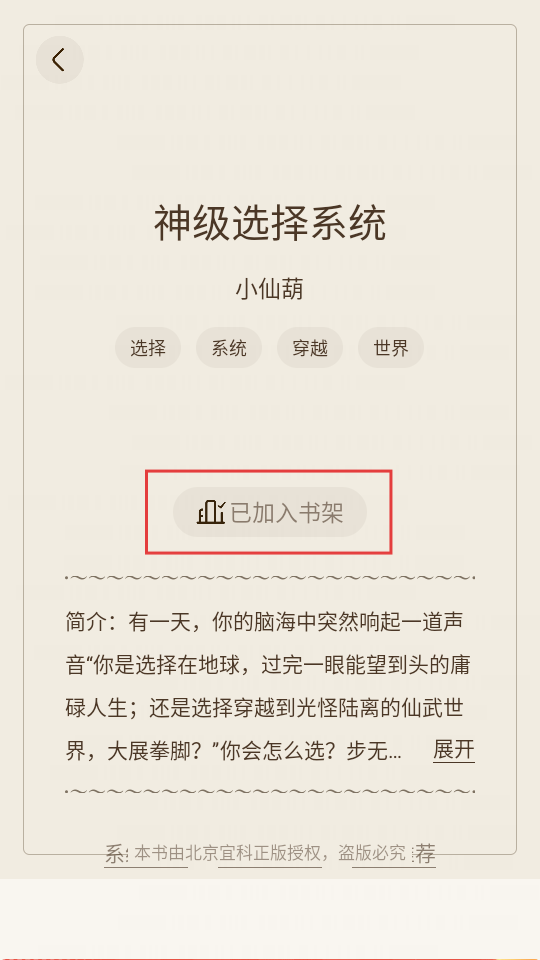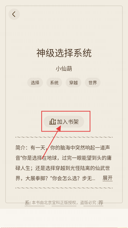 2、进入【神级选择系统】小说详情页,看看简介等内容,然后点击【加入书架】按钮,把小说加入书架啦。