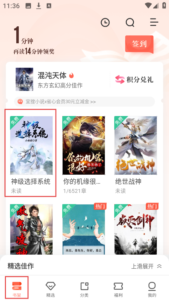 4、之后我们点击底部【书架】,进入书架页面,就能看到刚才加入的【神级选择系统】小说,随时都能阅读呢。