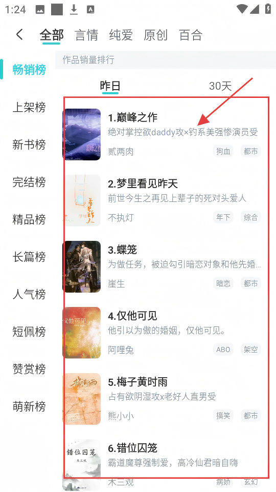 2、点击【排行】,进入作品销量排行页面,能看到各类热门作品,选感兴趣的去看呀。