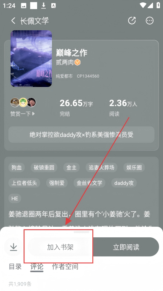 3、进入喜欢的作品详情页,点击【加入书架】,就能把作品存到书架,方便后续阅读啦。