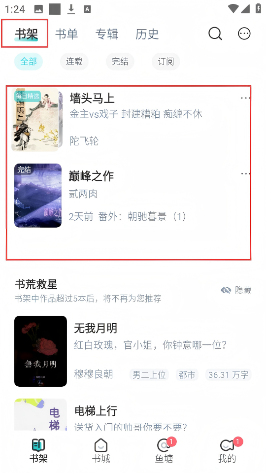 4、进入书架页面,能看到已加入的作品,想读哪本直接点,轻松开启阅读,超棒的。