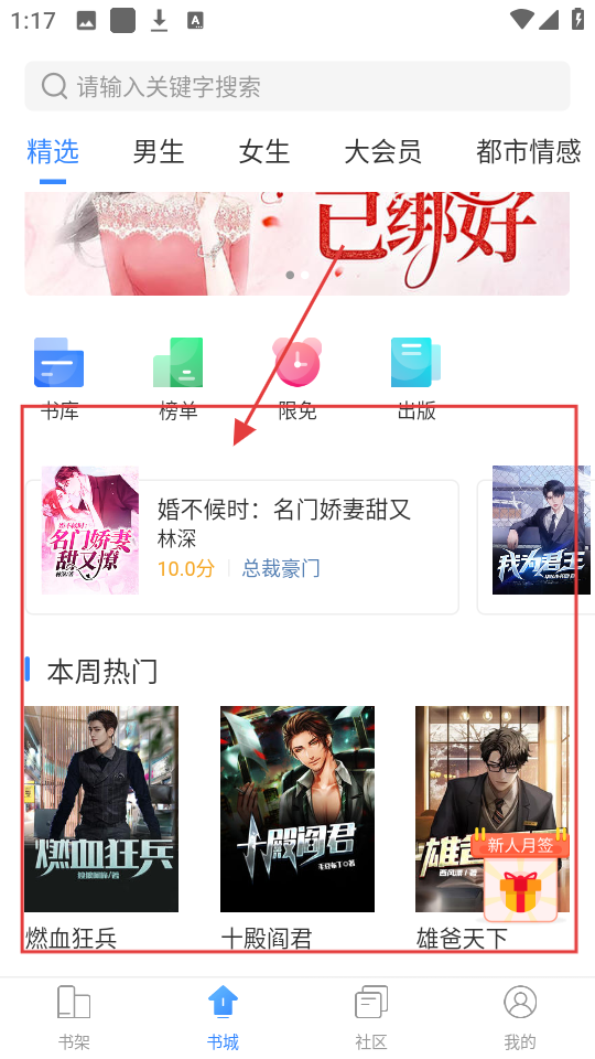 1、在书城本周热门板块找到《燃血狂兵》,点击进入书籍详情页哦。