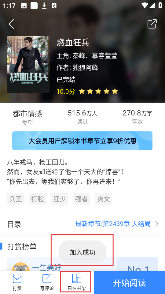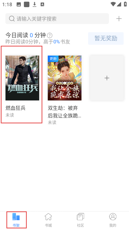 4、点击【书架】,就能看到添加的《燃血狂兵》,快速进入阅读啦。