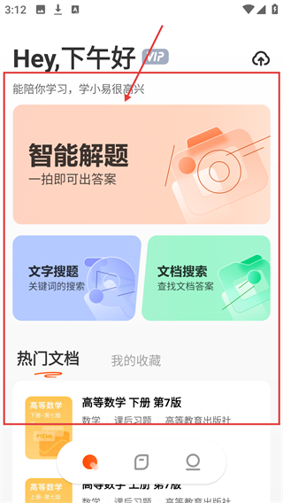 1、在学小易APP首页,点击【文字搜题】功能入口,进入关键词搜索界面,可通过文字查找题目答案啦。