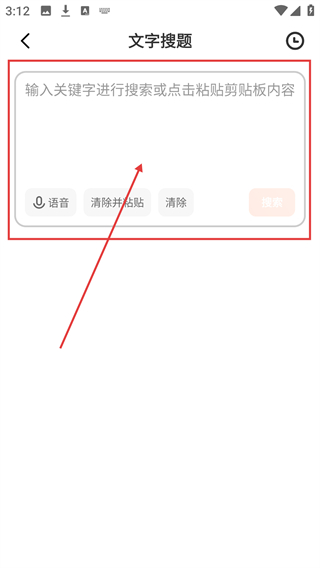 2、进入文字搜题页后,在输入框填写题目关键词,再点击【搜索】按钮,即可查找对应的题目资源哦。