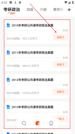 3、搜索结果页会展示相关题库(如考研政治真题),点击目标题库旁的【去练习】,即可进入刷题界面呀。