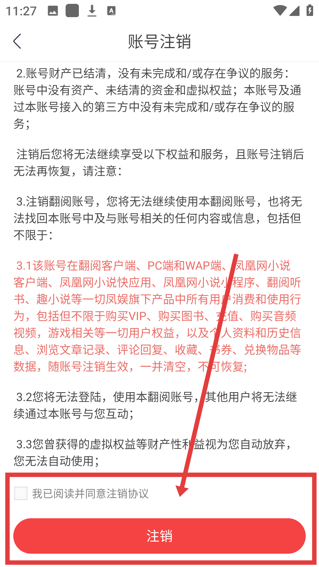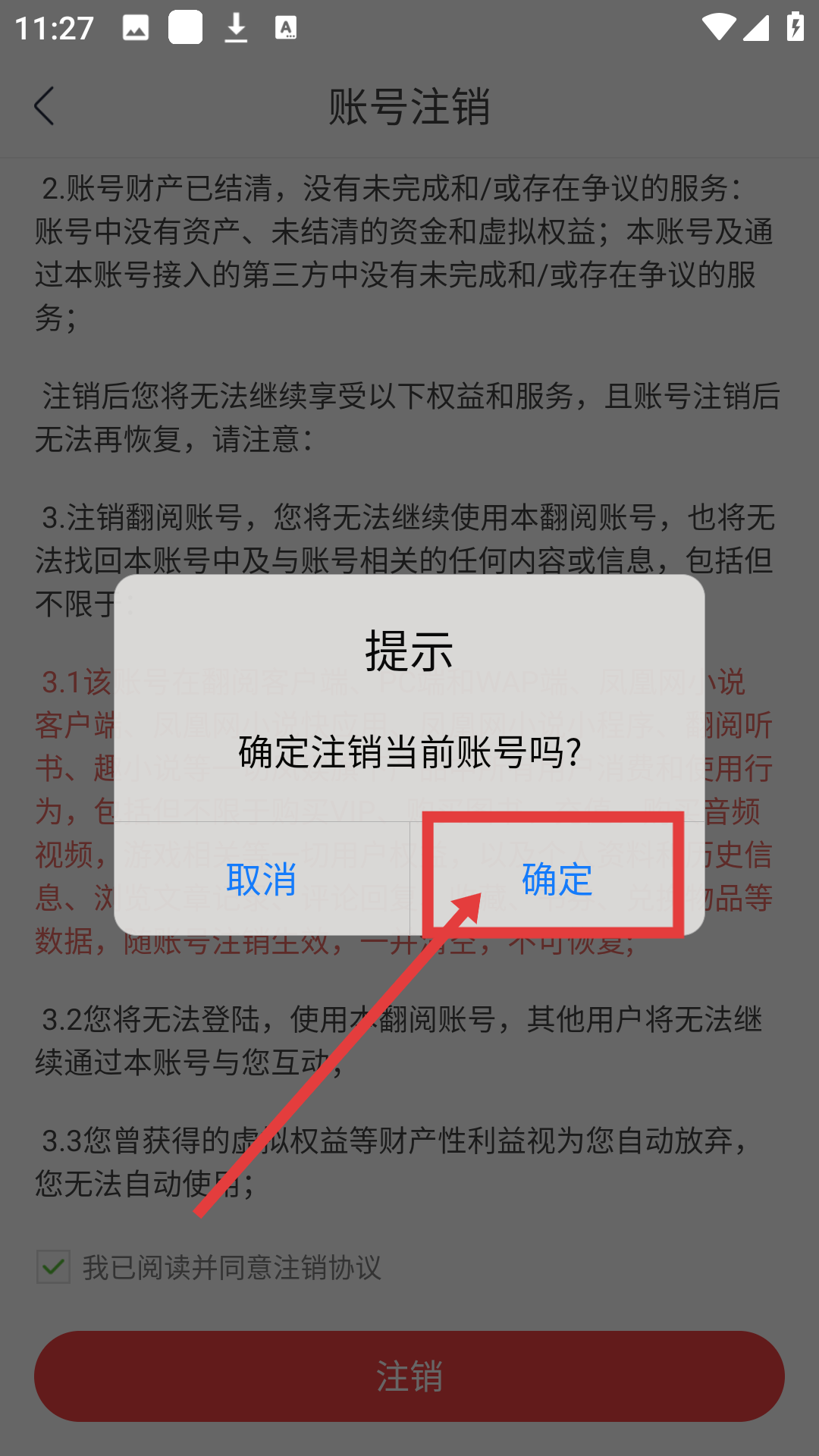 3、在账号注销页面勾选同意协议后,点击【注销】按钮,可触发注销确认提示哦。