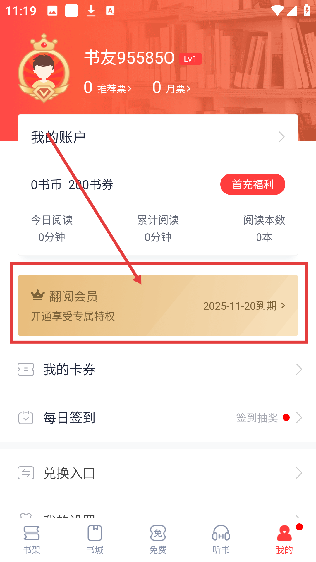 1、在书城页面,点击底部【我的】,可进入个人中心页面,准备查看会员信息啦。