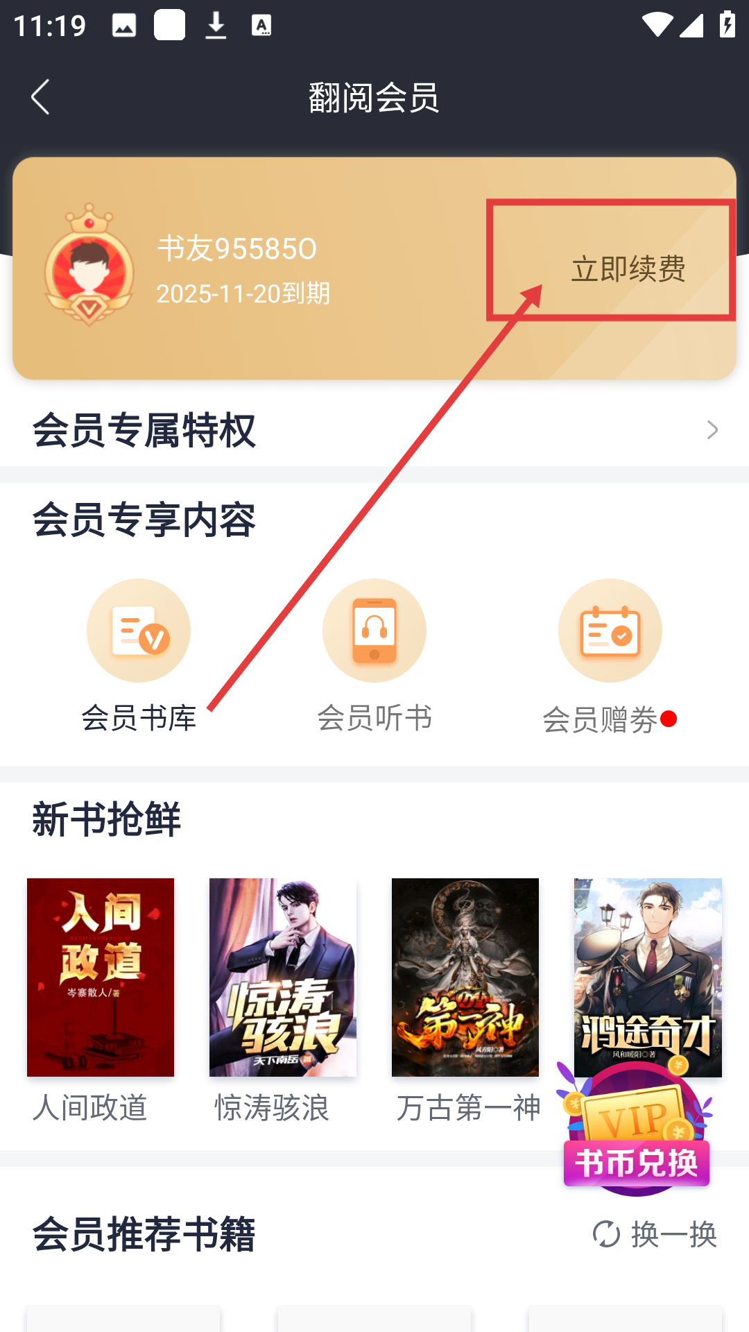 3、在会员详情页面,点击【立即续费】,可进入会员续费选择页面啦。