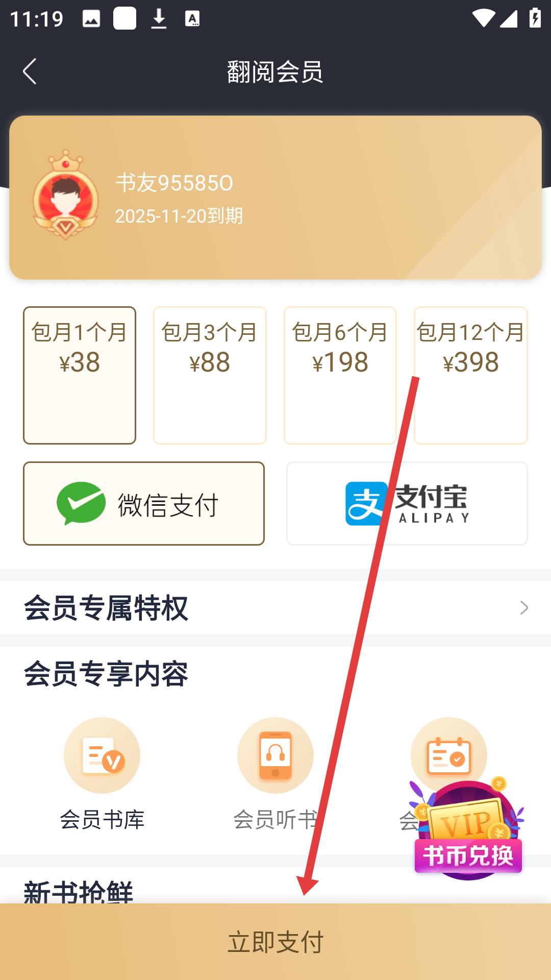 4、在续费选择页面,选择包月时长和支付方式后,点击【立即支付】,即可完成会员续费,享受会员特权哦。