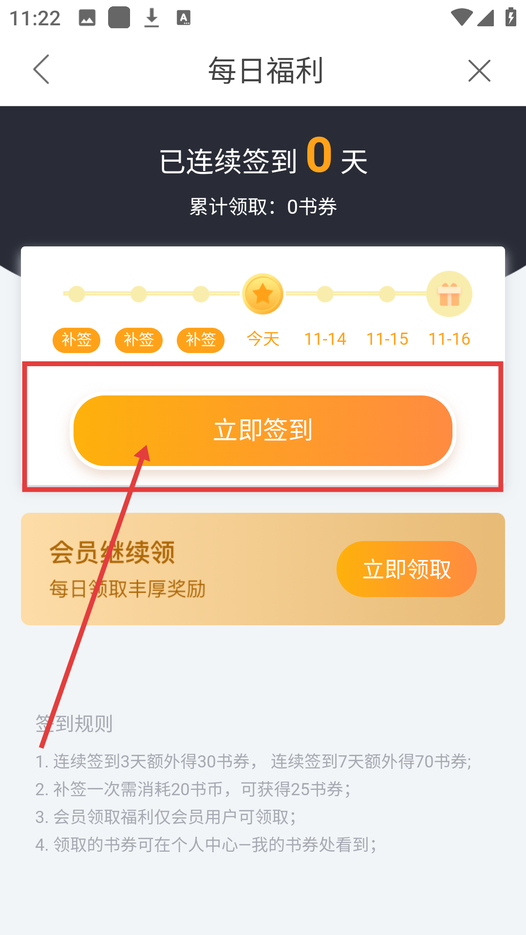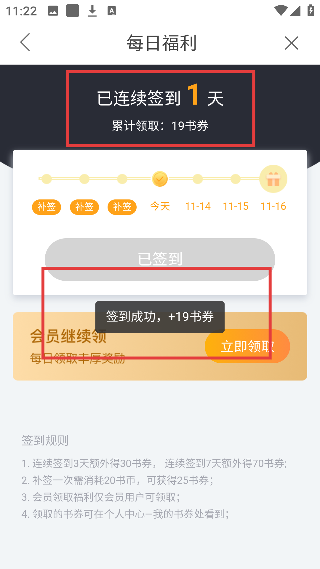 4、签到成功后,可看到连续签到天数和累计领取的书券,福利拿到手啦。