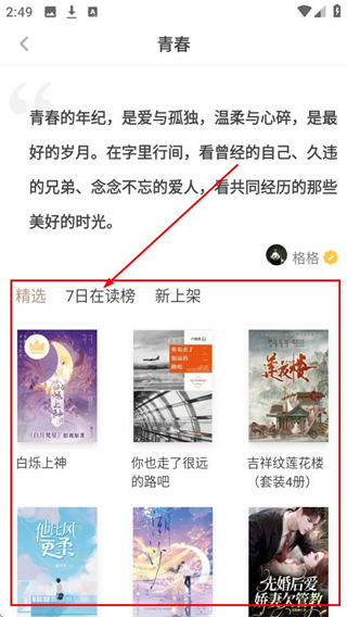 1、在青春分类页面,可浏览精选、7日在读榜等书籍列表,找到感兴趣的书籍啦。