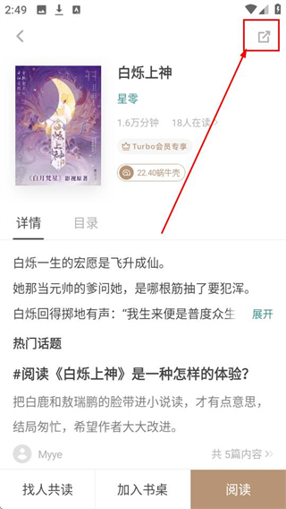2、点击感兴趣的书籍进入详情页后,点击右上角分享图标,可打开分享选项哦。