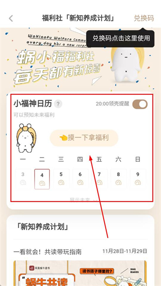 2、福利社点【摸一下拿福利】,参与小福神日历活动,领取蜗牛壳奖励啦。