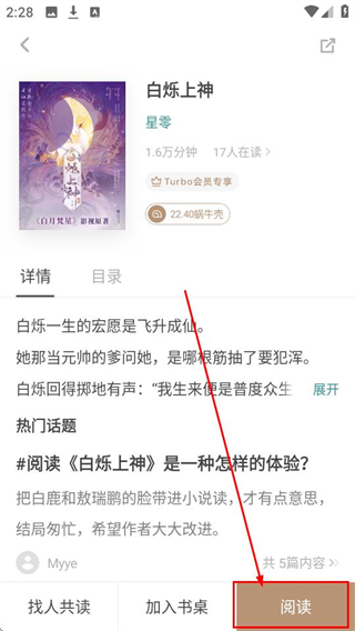 2、在书籍详情页点击【阅读】,就能开始阅读《白烁上神》,开启阅读之旅啦。