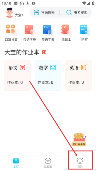 1、 打开作业精灵,进入软件后在主页我们就能看到口算批改、汉语字典、英语字典、错题本等家长工具,点击“口算批改”进入;