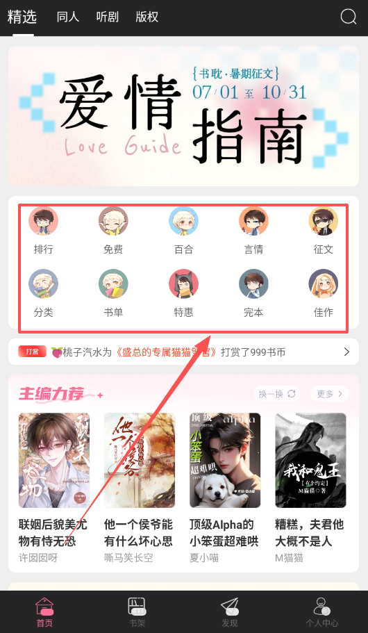 2、登录后你会看到精选页面,这里有很多分类比如同人、听剧、版权等,往下滑动能看到热门作品推荐和主播力荐书单。