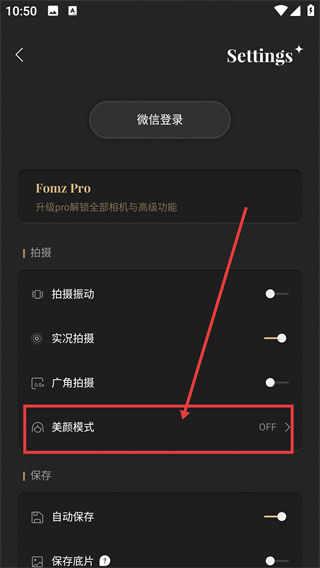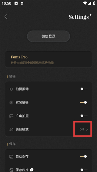 4、调整完美颜参数后,返回设置页会看到【美颜模式】已显示为ON,拍摄时就能应用该美颜效果啦。
