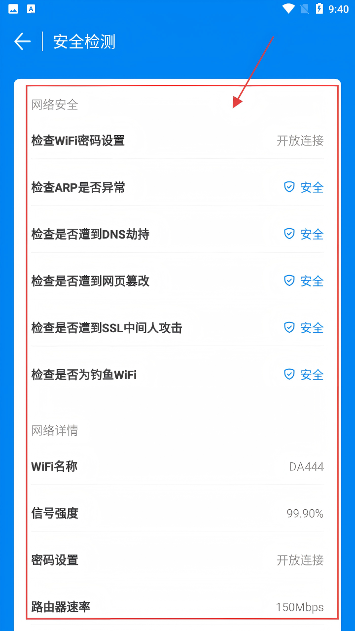 4、检测完成后,会呈现出详细的网络安全检测结果,包括各项安全检查情况和网络详情。
